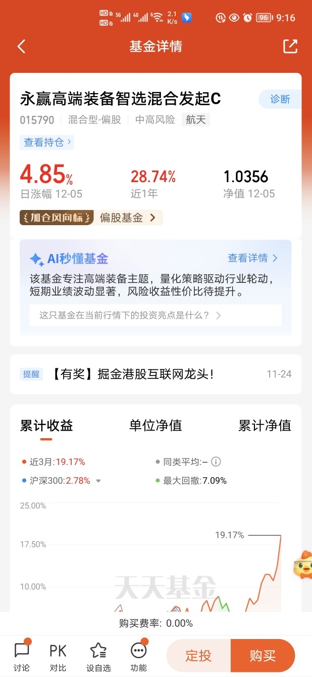 最近的表现很不错,$永赢高端装备智选混合发起C$ 已经连续上涨两天了,涨幅超过七个点,今天单日涨幅4.85%,是同类赛道的榜一大哥,实力自然是不容小觑。最近一个月的业绩也是在同类里排名第一。这支是首个聚焦卫星互联网的主动型基金,其持仓结构极为纯粹,紧密围绕卫星制造、火箭发射、地面设备、运营服务等产业链核心环节布局,全程不偏离主线,即便在板块阶段性波动时也坚守初心。这种高度聚焦的策略让基金具备了超高的收益弹性,能够精准捕捉产业发展的每一个红利节点#摩尔线程开盘价650元!一签赚超26.7万#