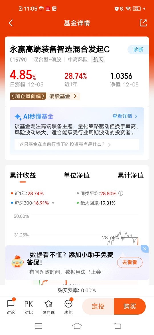 $永赢高端装备智选混合发起C$ 今天持仓又是大涨,卫星互联网趋势来了,近一周涨幅7.61%,近一个月涨幅15.35%,近半年涨幅33.71%,近一年涨幅28.74%,这个主投卫星互联网,持仓纯粹,弹性足,目前估值偏低布局更有力度,主动型基金具有较低的费用比率,一般流动性较好,持仓都是高科技赛道,值得期待。#流感药订单飙涨14倍 医药板块走强!#
