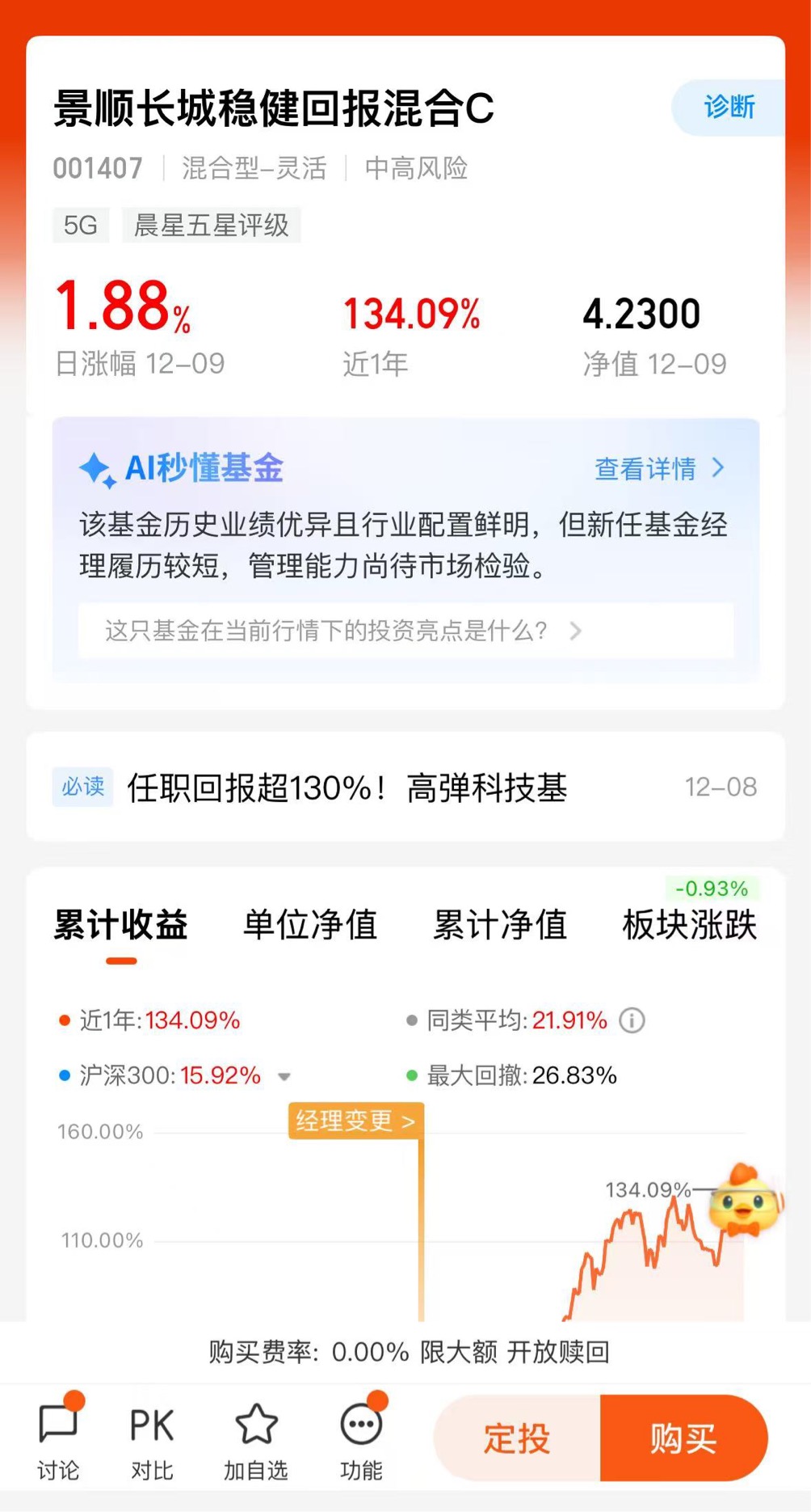 景顺稳健回报是高弹性科技基,最近表现很好,近半年涨了116%,净值已经创一年新高
