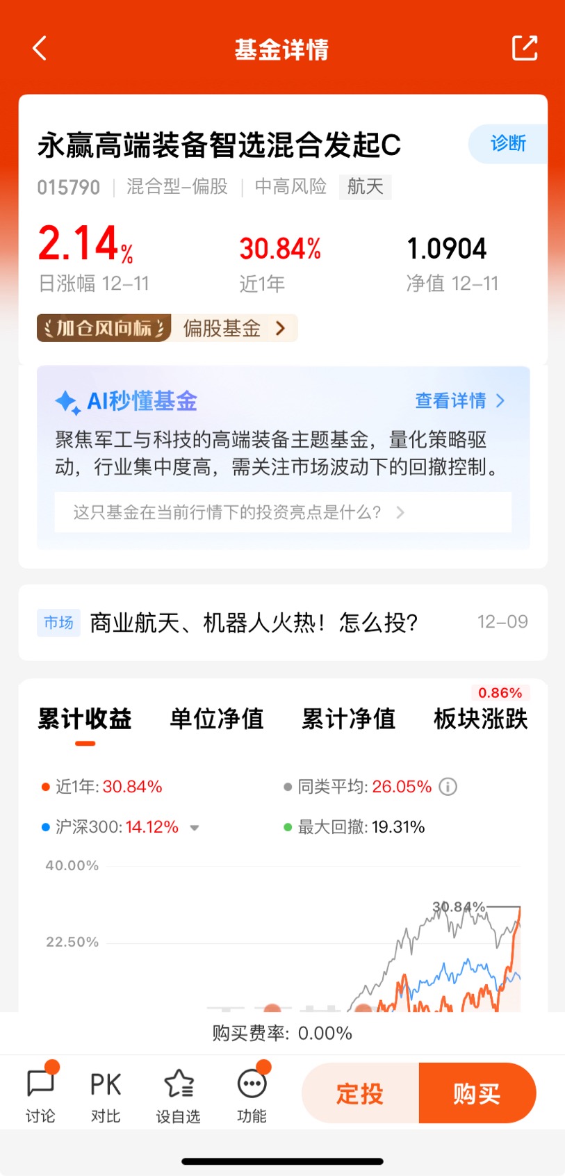 #【跨年坦白局】提问金梓才、陈果# $永赢高端装备智选混合发起C$ 是全市场唯一且也是第一个聚焦卫星互联网的主动型基金,纯度高,弹性大,昨天大涨2.14%,已经连涨6天,近一周收益10.40%,近一个月收益18.79%已经在同类中排名第4,近六个月收益42.16%,整体业绩优秀,卫星互联网产业链涵盖卫星制造、火箭发射、地面设备、应用服务等多个环节,各环节企业协同合作,共同推动产业发展;其发展将带动相关产业的发展,形成新的经济增长点。