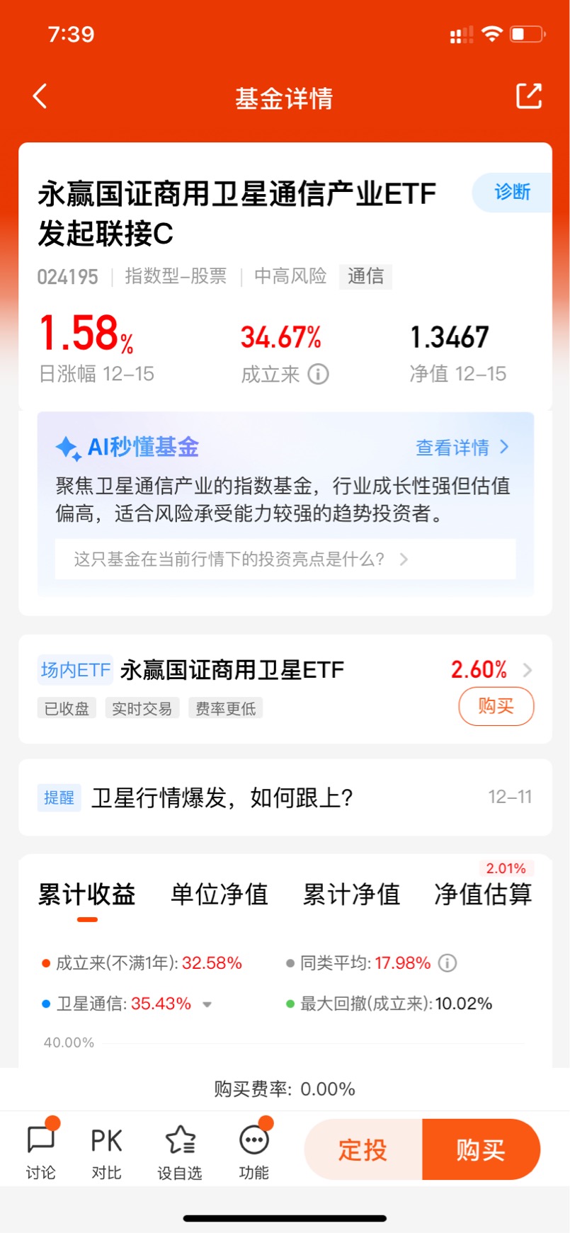 $永赢国证商用卫星通信产业ETF发起联接C$ 布局卫星通信前沿领域,今天涨了1.58%,也是八连涨的节奏,十四天十三涨啊,刚成立不久,各个阶段业绩表现都优秀亮眼的很了!