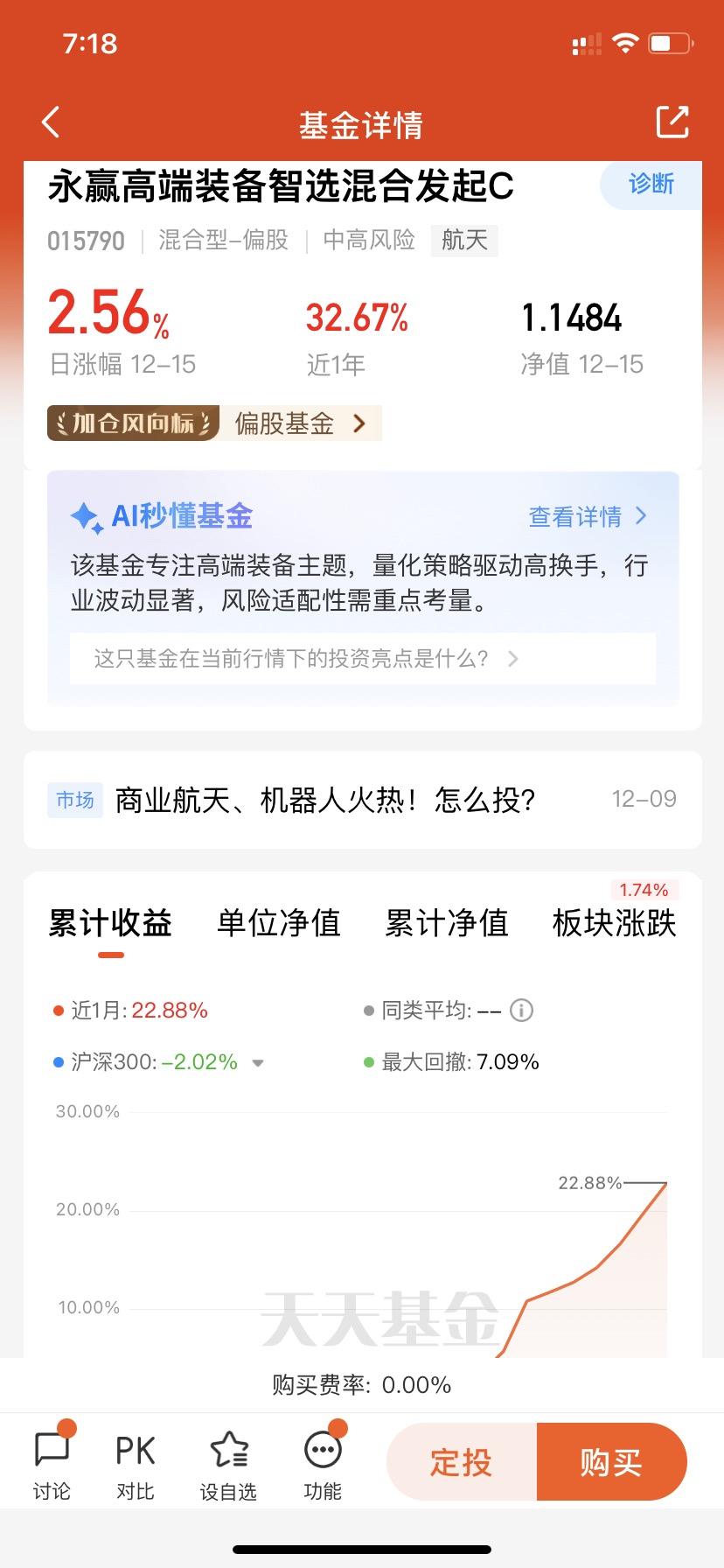 $永赢高端装备智选混合发起C$ 今天涨了2.56%,我的天,商业航天板块涨势要不要这么强,八连涨了,近一个月涨超24%,同类平均−0.46%,业绩弹性很强啊!这只把握卫星发展大机遇,继续期待了!