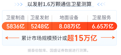√ 广阔市场前景:卫星产业市场广阔,包括卫星制造、卫星发射、地面设备、卫星服务四个环节。未来累计市场规模预计或超15万亿。