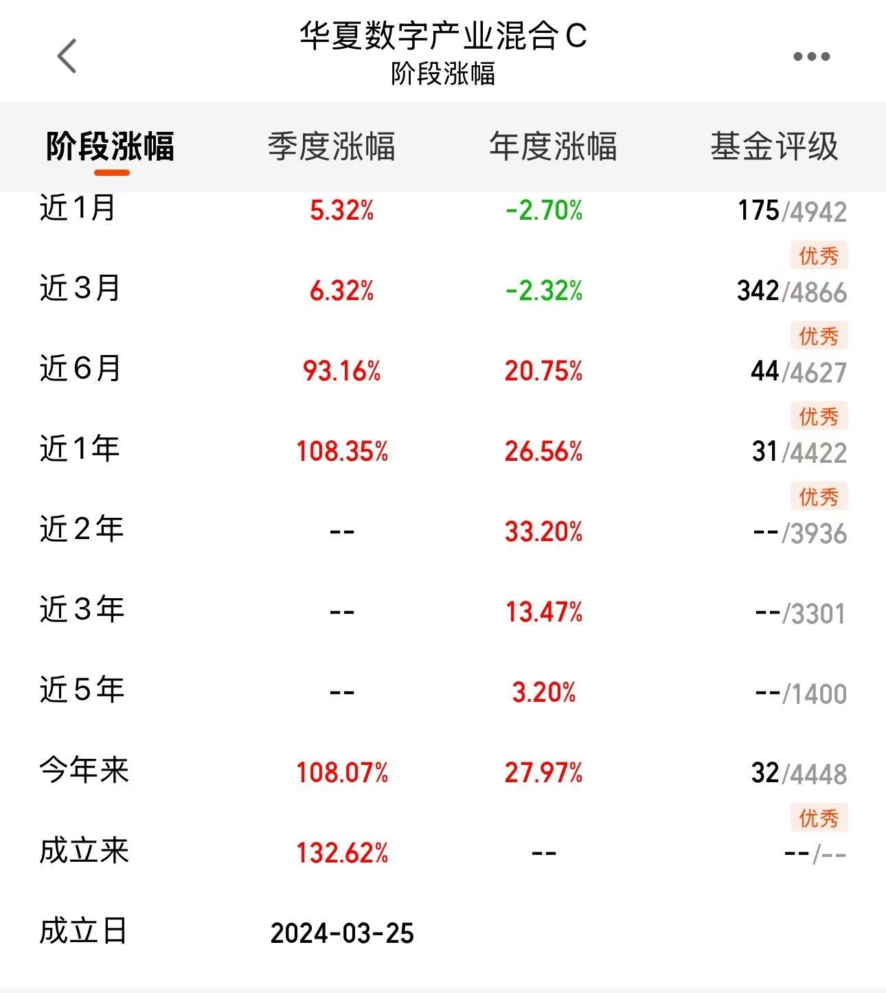 数字产业作为中国经济增长的新引擎,当前展现出强劲的发展势头,这里近6个月收益93%,近一年收益排名31,$华夏数字产业混合C$各阶段收益都不错