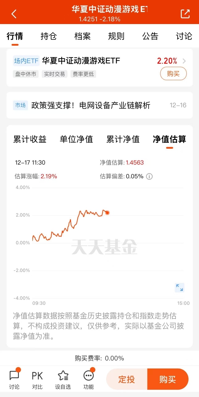 市场震荡今天有所改善,这基当前上涨2%+,布局点估值不高的$华夏中证动漫游戏ET