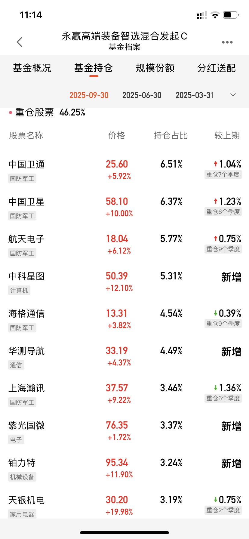 看目前$永赢高端装备智选混合发起C$ 这飘红的持仓股表现,今天逆势上涨啊!近一个月涨超21%,业绩表现还是出色的!卫星互联网强势反弹,目前盘中涨超4%,期待今天的表现了!12月以来,火箭发射活动持续不断,卫星应用端技术突破和商业落地加速,叠加上游密集组网,卫星互联网涨势持续,前景广阔,值得继续期待了!#沐曦股份今日上市!中一签能赚多少?#