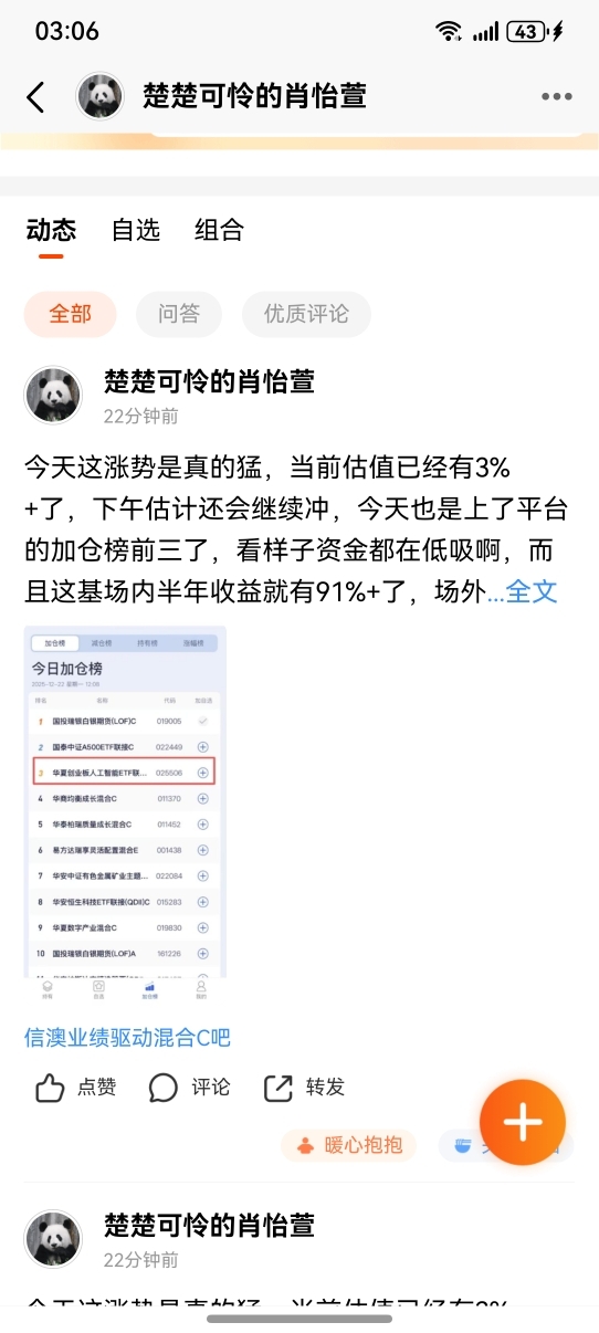 一个$华夏创业板人工智能ETF发起式联接C$,一个$华夏数字产业混合C$,今天加仓榜前十的俩华夏基都是我手里的重点基啊,加上今天行情走高,这俩基金估计至少都能有3个点,期待两个加起来给我8%不过份吧,妥妥的大吃肉,爽了