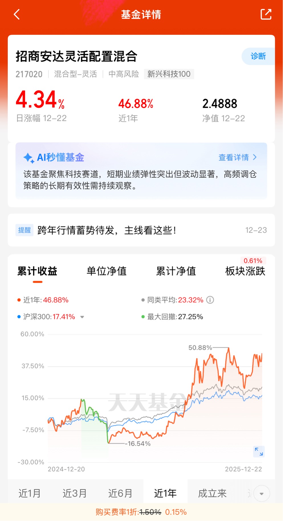 $招商安达灵活配置混合$ 作为招商旗下CPO主题基金,单日涨幅达4.34%,近六个月累计上涨超过68%,凸显其优秀的持仓策略。