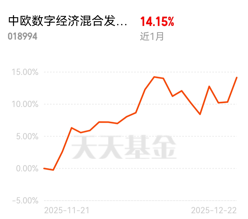 华为海思 100G 光芯片量产,高端光模块供应链国产化,算力产业链情绪修复,中欧数字经济混合发起 C 近 1 个月 14.15%,聚焦核心不跑偏。$中欧数字经济混合发起C$