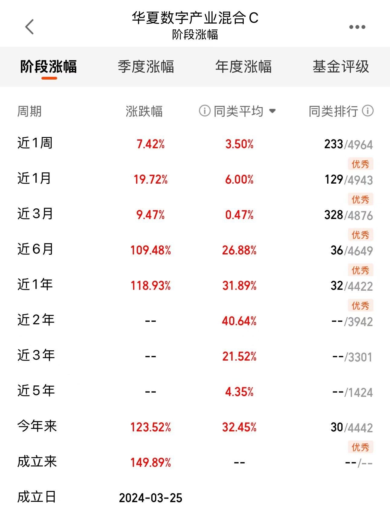 今天继续拿点,重仓的AI算力,有政策和需求的双重叠加buff,后续反弹肯定快,何况这基所有阶段排名都是同类前列,在全市场18000多只基金中排到前1%,这么优秀的盈利能力我是看好的$华夏数字产业混合C$