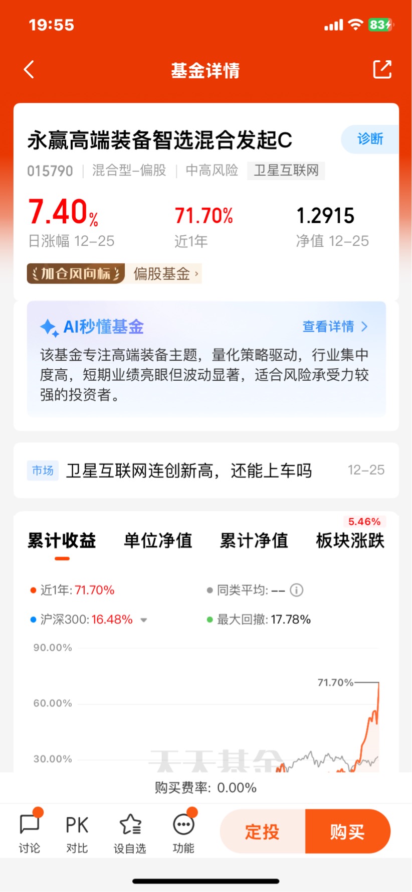 #商业航天赛道爆火:2026年行业或迎质变# $永赢高端装备智选混合发起C$ 继昨天暴涨7.17%今天继续暴涨7.40%,连涨两天涨幅超过14个点,继续坐稳榜一大哥,近一个月收益37.53%,近三个月收益44.88%,近六个月收益65.03%,近一年收益71.70%创近一年新高,作为全市场唯一且也是第一个聚焦卫星互联网的商业航天高弹性卫星基金,各阶段业绩都是相当优秀的;国家将卫星互联网纳入“十四五”规划重点任务,频谱、轨道资源分配政策逐步完善,为产业发展提供制度保障。
