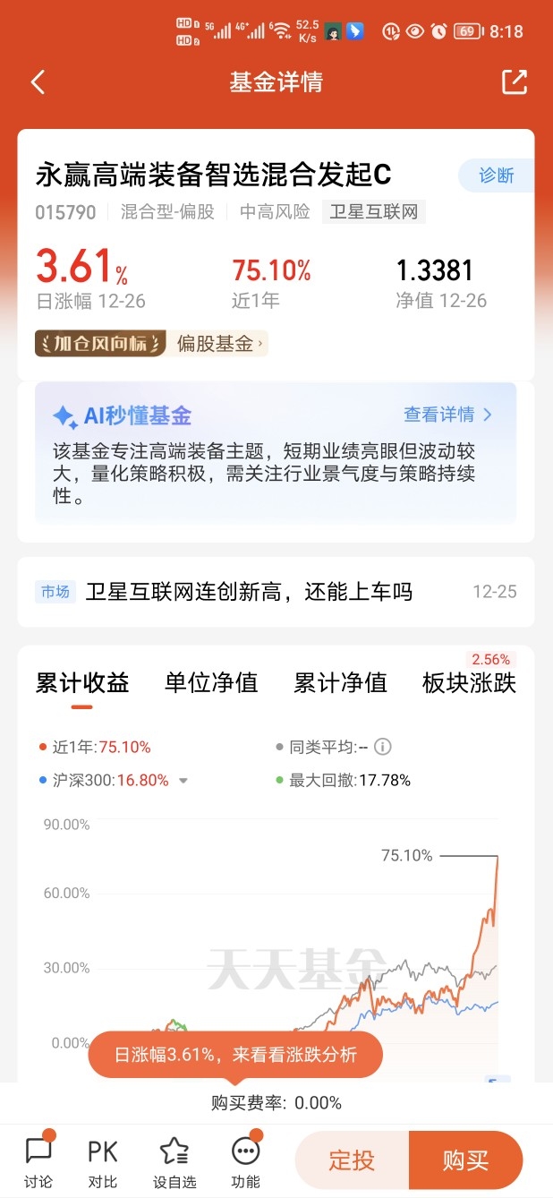 我只能说这边真的是强者恒强,$永赢高端装备智选混合发起C$ 已经连续上涨三天,涨幅超过18个点了, 最近一年的涨幅更是高达75个点,同类排名非常优秀。商业航天和卫星互联网作为新主线的趋势已经愈发明确,这个凭借其唯一聚焦的独特定位、亮眼的业绩表现以及对行业的深度把握,成为切入这一赛道的优质选择。在产业加速发展的浪潮中,这样的专精标的无疑能提供更精准的布局机会#商业航天赛道爆火:2026年行业或迎质变# #沪指小碎步八连阳!下周一能否九连阳?#