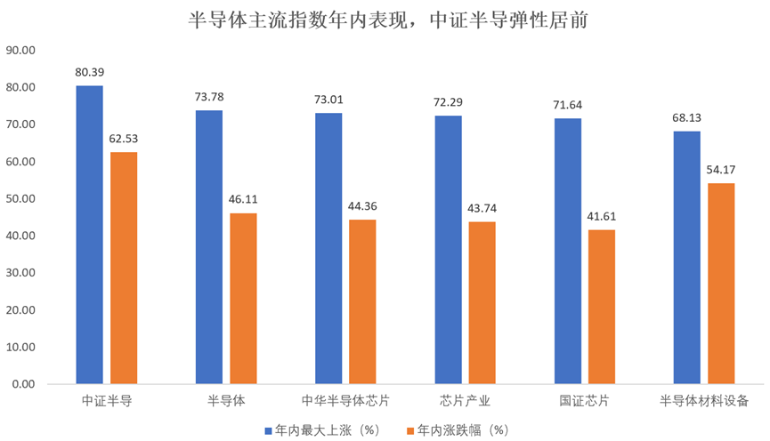 从年内的最大上涨和涨跌幅看,中证半导指数的表现都遥遥领先,截至12月29日,中证半导年内涨幅超62%、最大上涨超80%,弹性十足~
