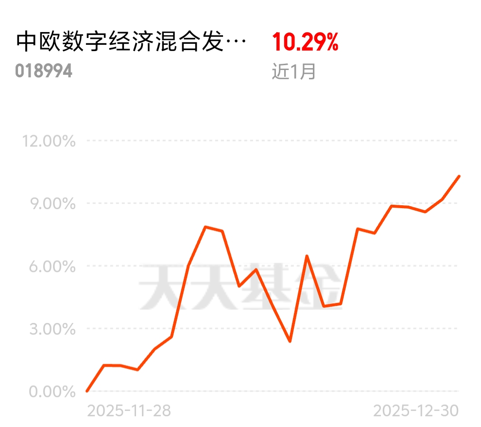 中央经济工作会议深化 “人工智能 +”,政策红利持续释放。光模块需求超预期,算力需求激增,中欧数字经济混合发起 C 近 1 月 10.29%,聚焦核心环节不分散,短期配置跟着政策走准没错。$中欧数字经济混合发起C$