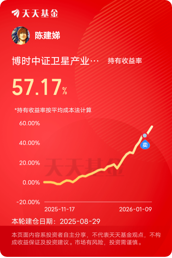 2026年我的投资方向特别明确,$博时中证卫星产业指数C$ 就是我的核心配置!卫星指数目前涨了9.7个点,当下全球卫星产业的爆发势头特别猛,我国已向国际电信联盟提交20万颗卫星的频轨资源申请,SpaceX也获批再部署7500颗第二代星链卫星,全球低轨卫星组网全面进入密集建设期,行业红利已经到了实打实的兑现阶段。现在卫星互联网早跳出单一军用场景,正加速渗透到各类民用领域,通信、导航、遥感等上下游细分板块,全都是能落地的增量市场,整个产业链的成长空间彻底打开。这只基专盯卫星产业主赛道,持仓全是板块里的核心龙头企业,不蹭杂七杂八的热点,能精准跟上行业每一波利好节奏,之前入手后的收益表现一直很亮眼。我打算把年终奖的大部分都投进去,再搭配每周定投,后续板块就算出现波动,正好借定投摊薄成本,牢牢抓住卫星赛道这波大行情,全力冲刺2026年的投资收益。#2026我的新年投资计划# #晒收益#