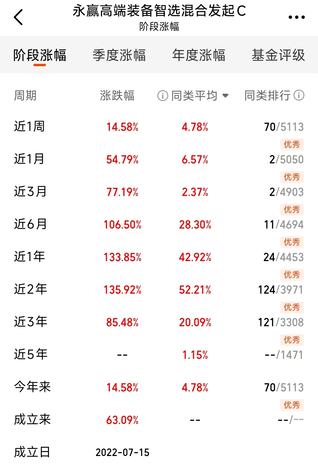 永赢高端装备智选混合发起C(015790)作为全市场首个且唯一聚焦卫星互联网的主动型基金,无疑是把握这一产业机遇的优质标的。它的持仓纯粹且不漂移,弹性超高,能够精准捕捉产业链各环节的增长红利。即便在赛道处于低点时,也始终坚守核心布局,这种坚定的投资策略让其业绩持续爆发。近1周上涨14.58%,近1月大涨54.79%,近3月上涨77.19%,连续两阶段收益第一;近6月上涨106.5%,近1年上涨133.85%,近2年上涨135.92%,连续两阶段收益翻倍,用优异的业绩赢得了市场的青睐。