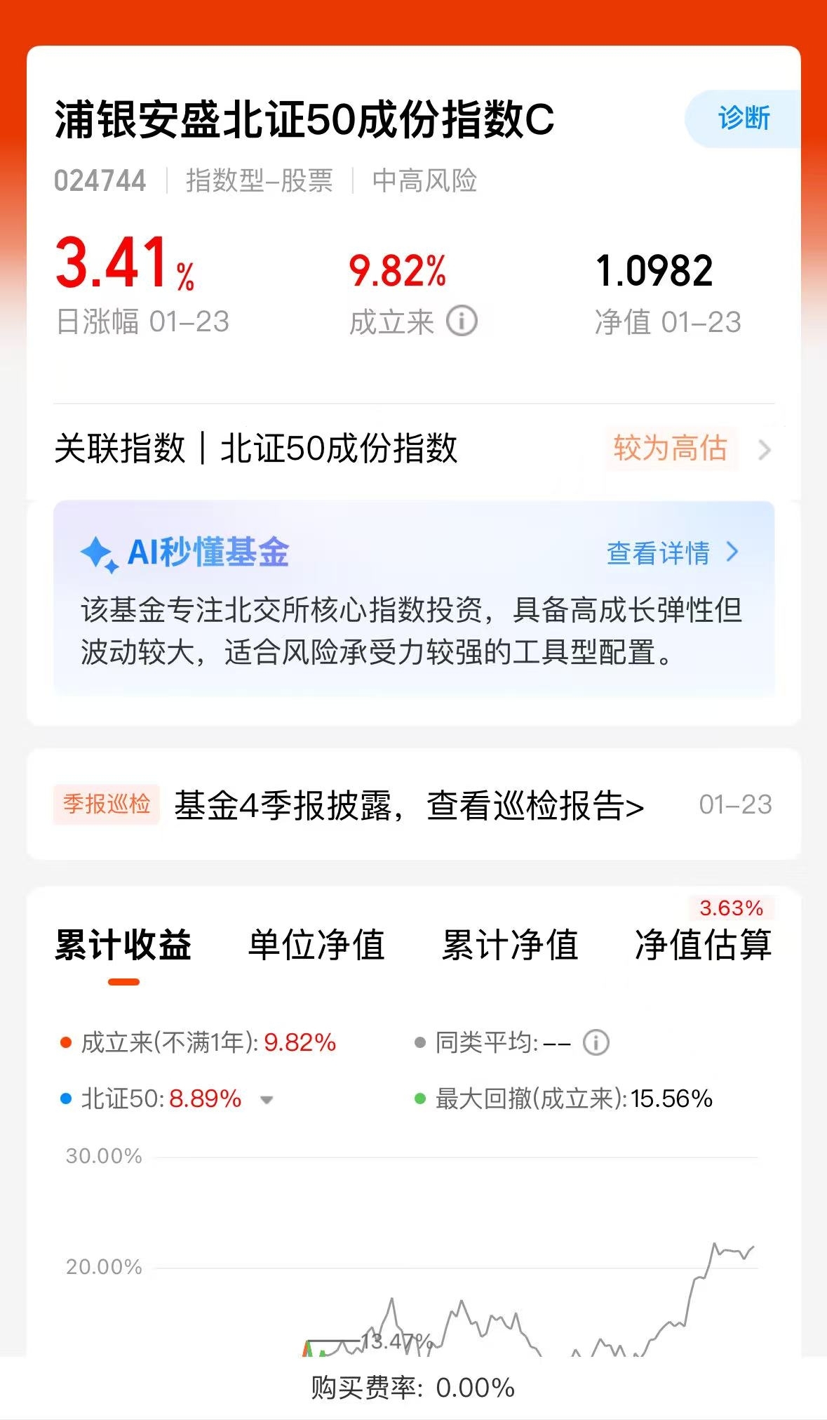 很多北证50基金都限购,浦银安盛北证50不限额,今天大涨3.41%$浦银安盛北证50成份指数C$