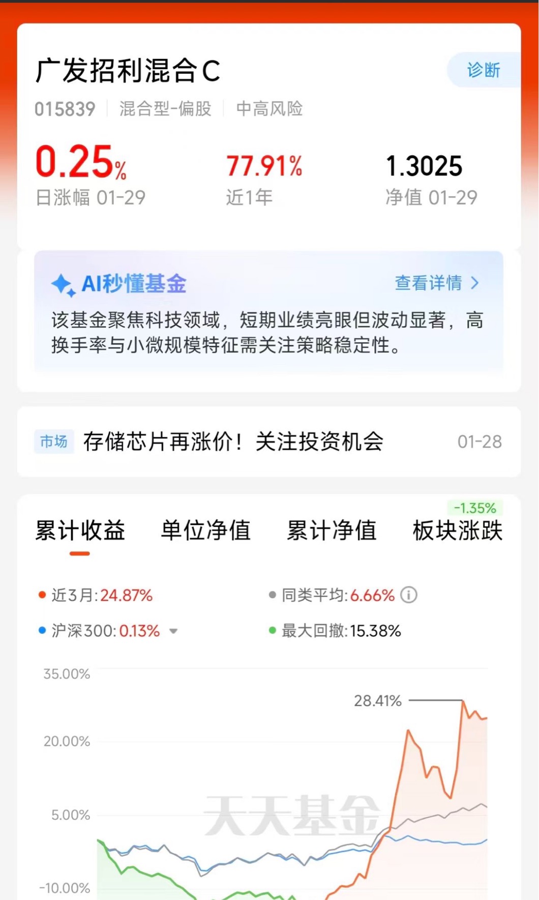 其他基都跌了,广发招利混合C昨天涨了出乎意料,表现不错,趋势摆在这里,都说2026是商业航天大年,展会一个接一个,300多家企业同台竞技。这种产业趋势下,拿住核心基金比较省心。准备分批加点仓$广发招利混合C$