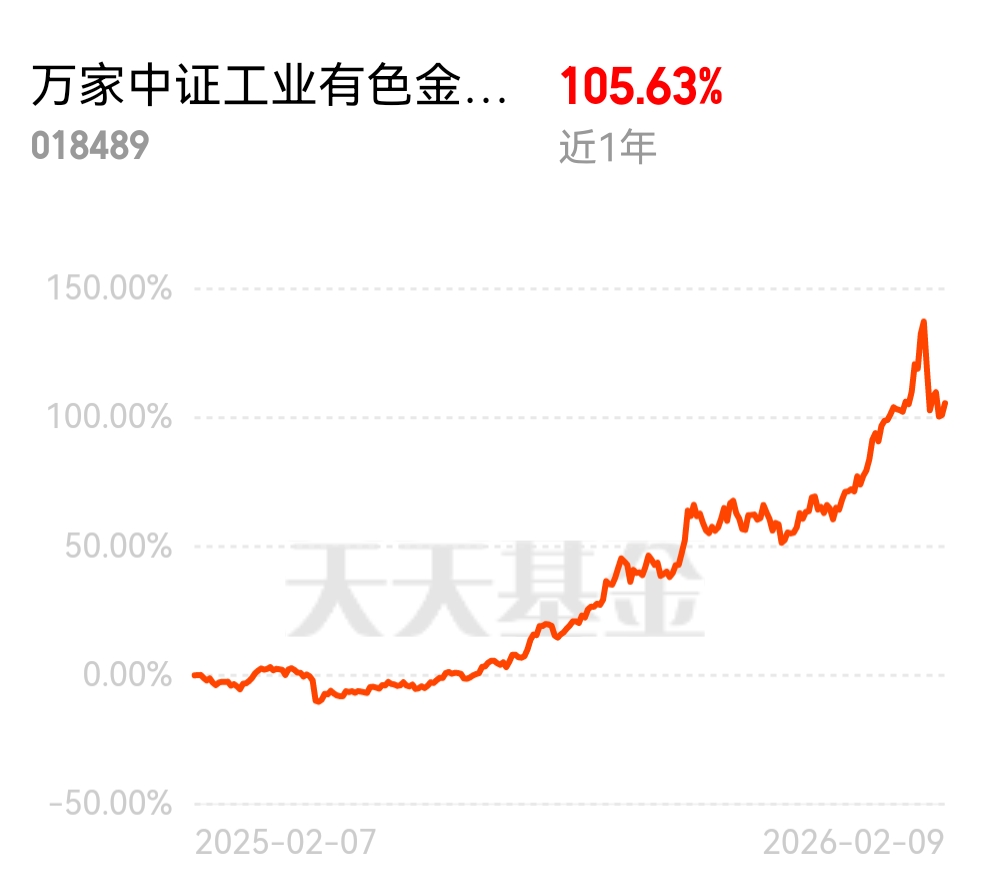 $万家中证工业有色金属主题ETF发起式联接A$ ,爆发力太惊人了,紧跟金铜等顺周期品种行情,跌了也不怕,涨上来很快,趁着回调上车咯