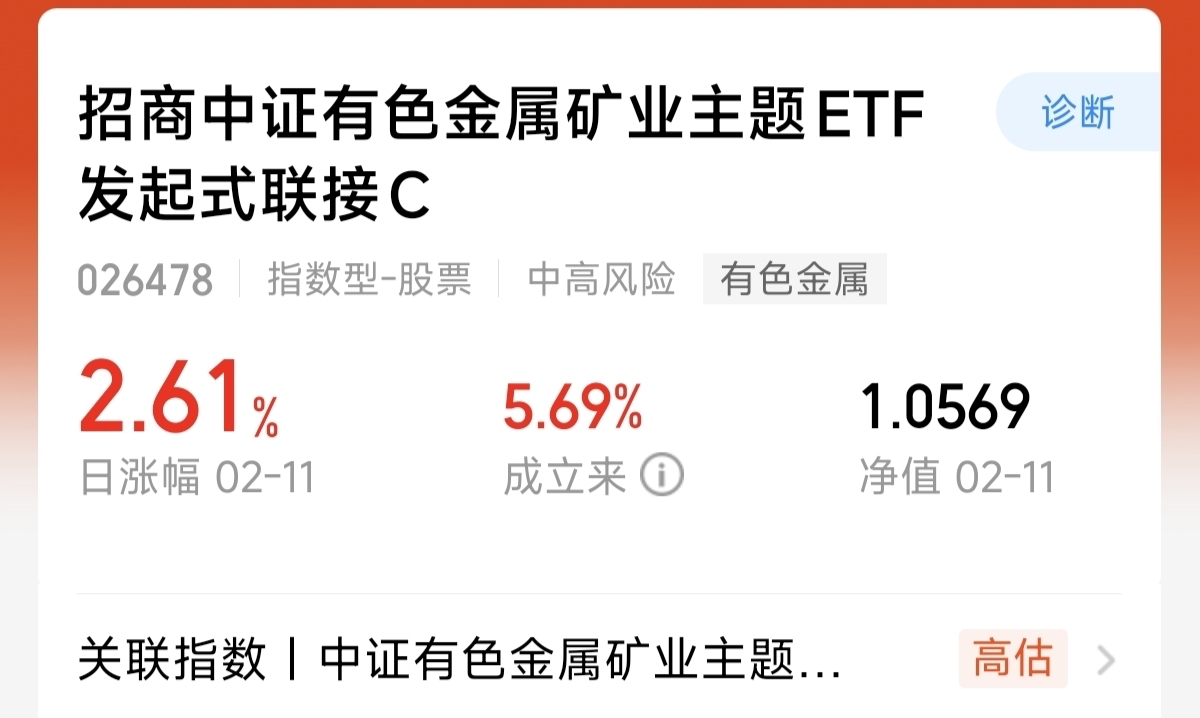 $招商中证有色金属矿业主题ETF发起式联接C$ 这次聚焦矿业主题的指数基金!主要覆盖有色金属矿业主题,昨天上涨了2.61%,今天估值,而且随着全球矿产收缩,矿业股上涨的趋势还比较大!我看好基金长期的稳定收益表现!