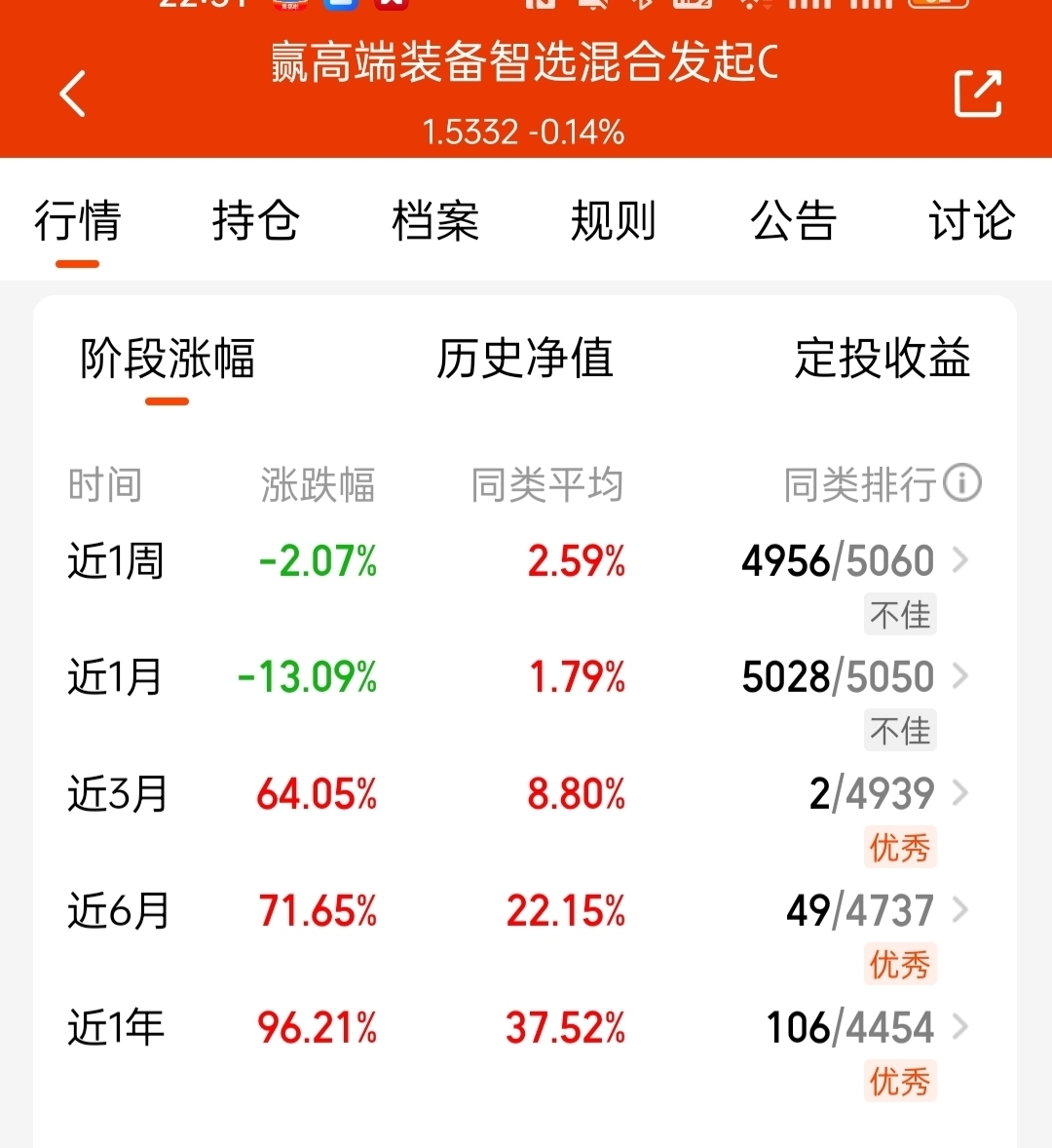 $永赢高端装备智选混合发起C$ 曾经的优秀哪儿去了?现在这支基无论周排名还有月排名,在同类中都倒数了,经理,你不觉得丢人吗?再别说什么看好未来的大话了,未来不是你决定的,跟上风口,及时调仓换股,让基民收益才是硬道理,否则总有一天基民会都跑光的,而你有可能会被公司追责
