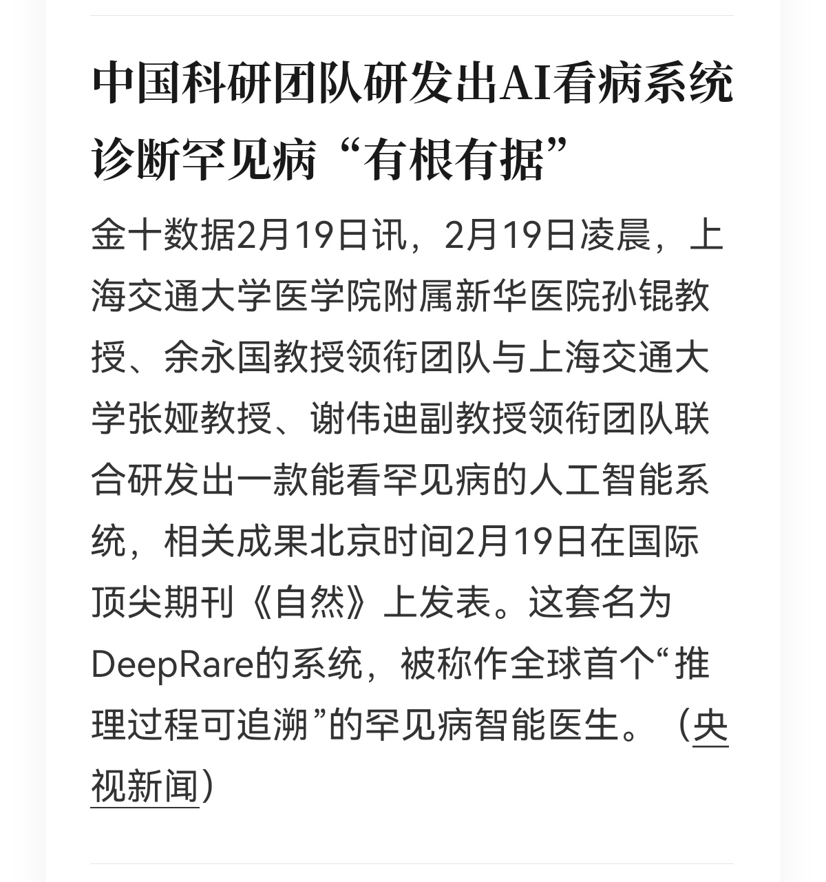 中国AI研发同样捷报频传。上海交通大学医学院与上海交大联合团队研发的DeepRare系统,成为全球首个“推理过程可追溯”的罕见病智能医生,成果发表于国际顶尖期刊《自然》。此外,“太初元基”已完成智谱GLM-5.0及阿里千问双开源大模型的深度适配,自研T100加速卡及阶梯式开发工具链显著降低了国产AI生态的迁移成本。