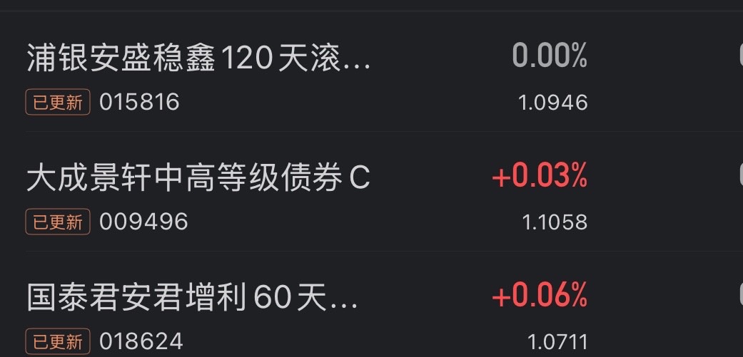 $大成景轩中高等级债券C$ 收了3个蛋$国泰君安君增利60天滚动持有债券发起式A$ 收了6个蛋