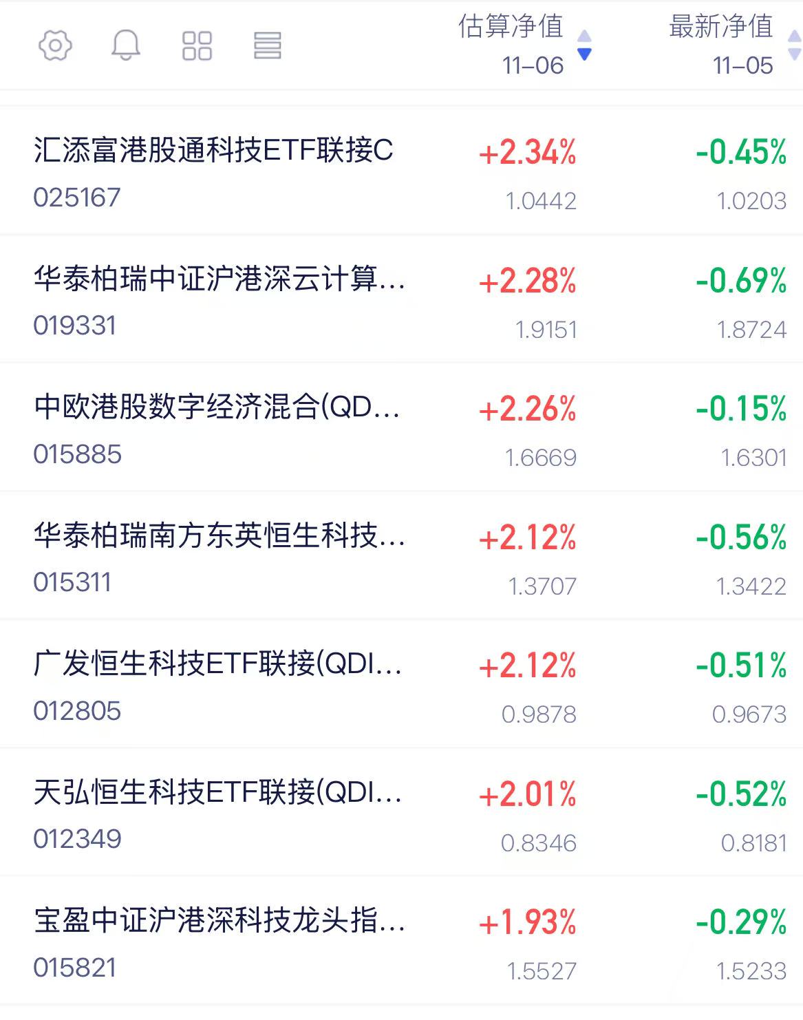 $华泰柏瑞恒生科技ETF联接(QDII)C$ 盘中涨幅预计2.12% $广发恒生科技ETF联接(QDII)C$ 盘中涨幅预计2.12%