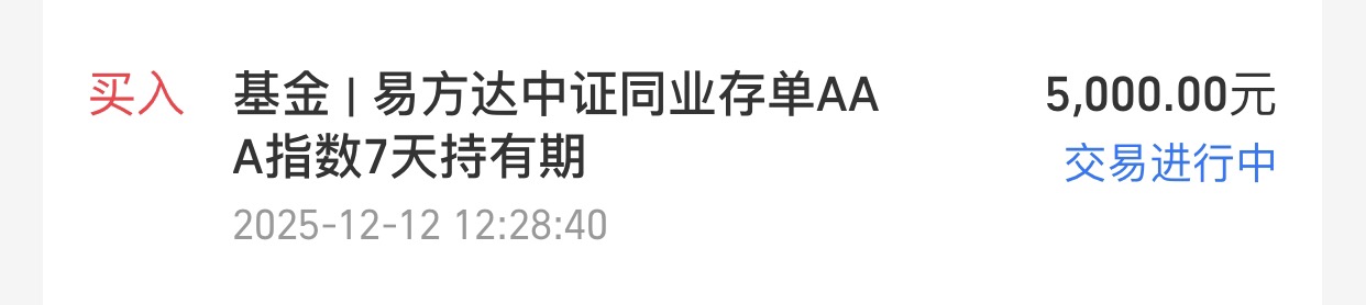 $易方达中证同业存单AAA指数7天持有$ 加仓5000元。最近债市的表现还算稳定,股市的走势还是偏震荡,今天债市天气还可以,年底我个人的思路是以稳为主,所以今天我加一笔易方达中证同业存单AAA指数7天持有期,它跟踪中证同业存单AAA指数,还配置了少部分的利率债和信用债,会根据市场变化来调整久期和杠杆,提升灵活性的同时也能增厚组合弹性,它近一年收了155个蛋,波动较小,整体来看属于稳稳的幸福类型,我把它作为余额宝的平替,拿着也比较踏实,今天先上车5000元打个底,后续再择机递增。