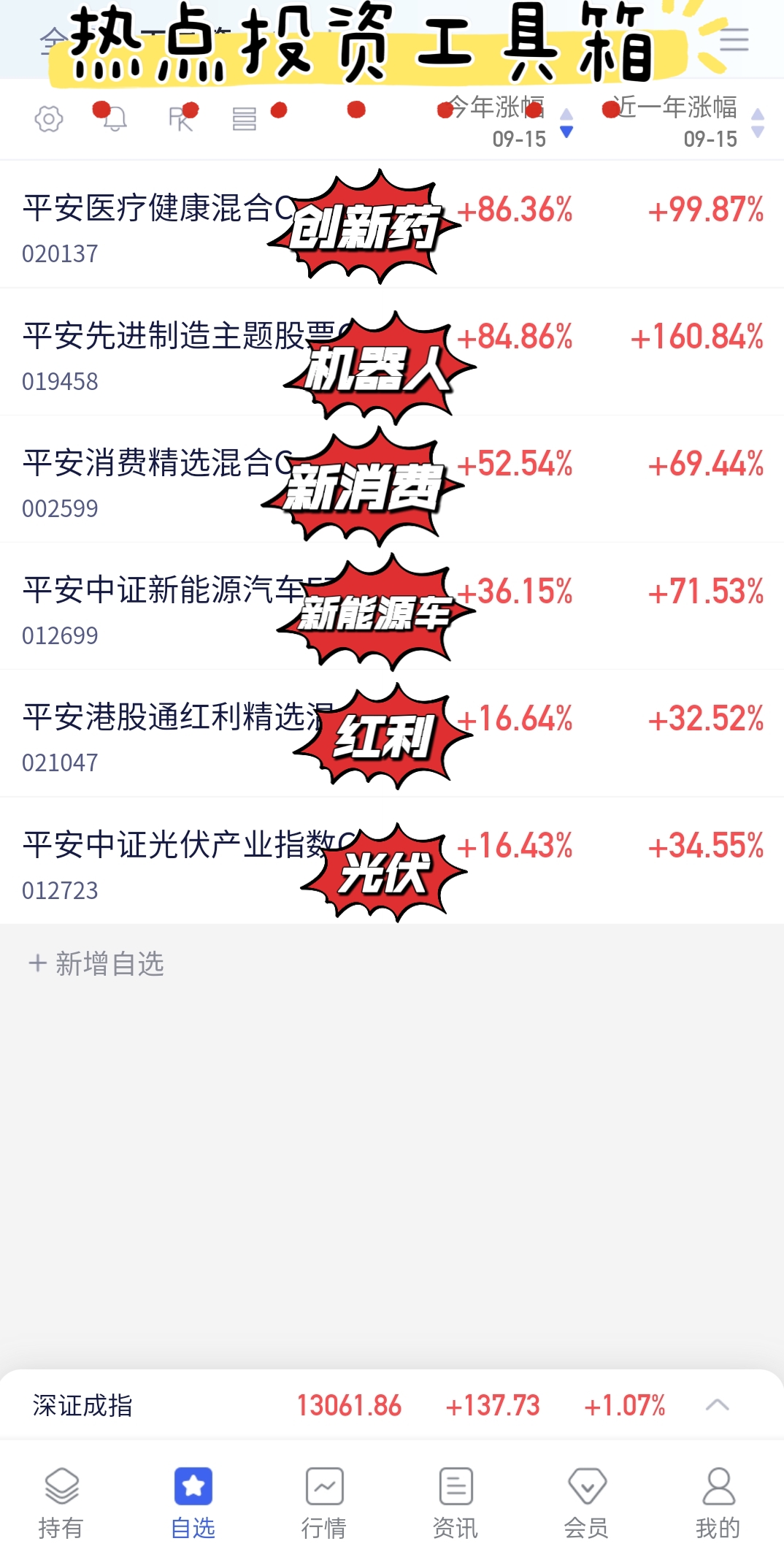 $鹏华新能源汽车混合C(OTCFUND|016068)$ $华夏中证新能源汽车ETF发起式联接C(OTCFUND|013014)$ $广发中证全指汽车指数C(OTCFUND|004855)$ $华泰柏瑞光伏ETF联接C(OTCFUND|012680)$ $银华中证光伏ETF发起式联接C(OTCFUND|012929)$ $汇添富中证光伏产业指数增强发起式C(OTCFUND|013817)$ $东方阿尔法优选混合A(OTCFUND|007518)$