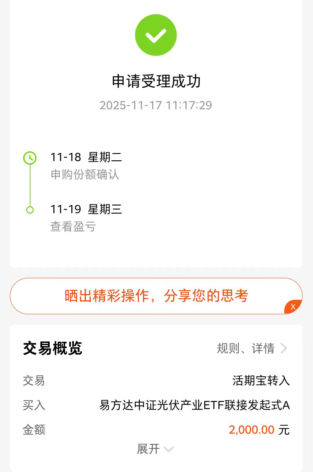 友友们,上周五沪指失守4000点,板块分化,光伏板块继续调整,调整也是机会,随着储能概念不断增强,光伏板块也是持续上涨,偶尔还能暴涨,我继续低吸易方达中证光伏产业ETF联接发起式A,受益于全球能源转型需求以及反内卷政策推进,我期待后期行情。