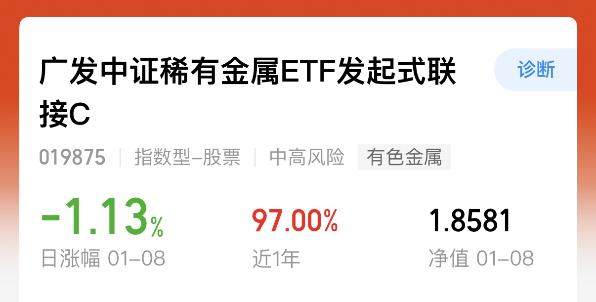 跟踪的稀有金属指数这会看涨2.7%左右,买对了!昨天加仓今天就吃肉,看来主线板块有调整就可以看做是加仓机会呀!$广发中证稀有金属ETF发起式联接C(OTCFUND|019875)$