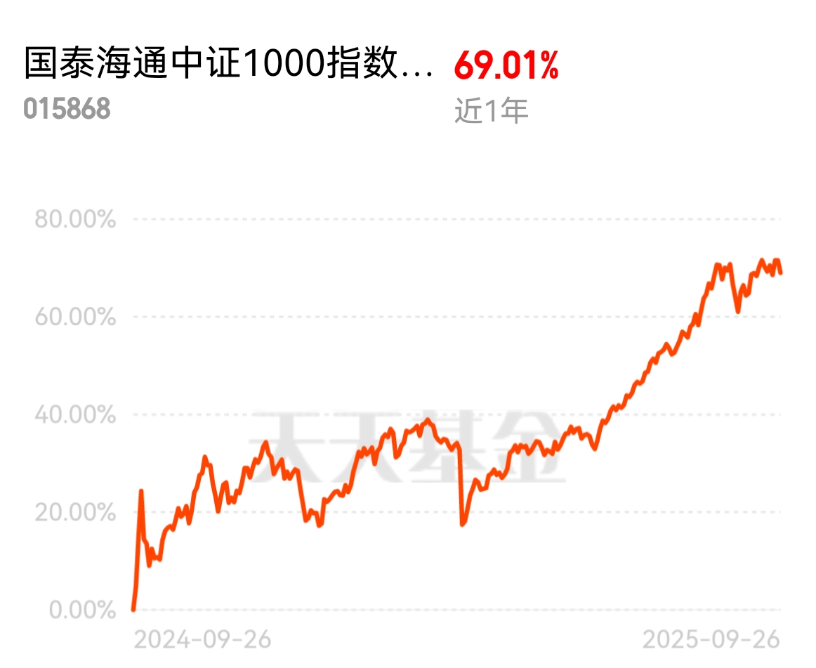 我拿着的是蚂蚁金选基金:015868国泰君安中证1000指数增强基金,或者有人问为什么不选沪深300指数?沪深300指数都是比较大的上市公司,中证1000指数是市值比较小的公司,在牛市里面跑得比较快,用最近一年的涨幅来比较,沪深300指数涨28%,中证1000指数涨51%,而015868涨69%,一年时间跑赢沪深300指数月40%,跑赢中证1000指数18%,根据平台的数据显示015868连续4年跑赢中证1000指数40%,都是实实在在的收益。今天继续买入1000元015868。