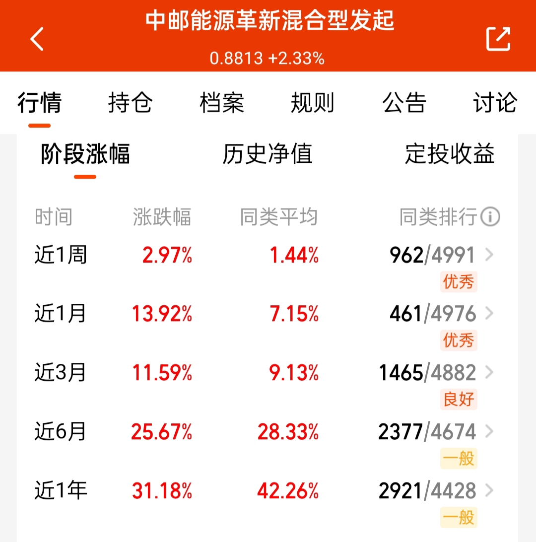 今天再来补点这个固态电池的$中邮能源革新混合型发起C$ ,各阶段业绩不错,昨天也大涨超2.3%,弹性挺好
