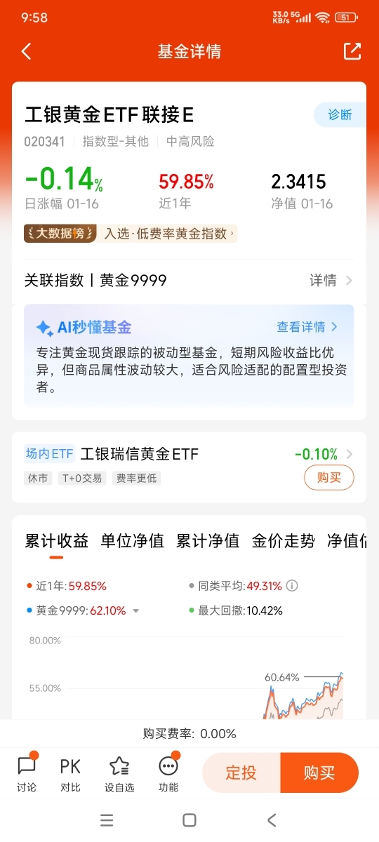 去年初开始关注$工银黄金ETF联接E$ ,当时只是想着对冲不确定性,结果一年下来58.7%的涨幅属实惊喜。黄金这类资产,平时不起眼,乱世显价值。费率优势明显——0申购费,管理费0.15%,持有七天以上免赎回费,长年累月能省下不少成本。最近金价突破4500美元,背后是降息周期与地缘冲突叠加,央行购金潮也没停过。黄金不像股票需要研究财报,价格锚定现货,跟踪误差小,适合懒人。
