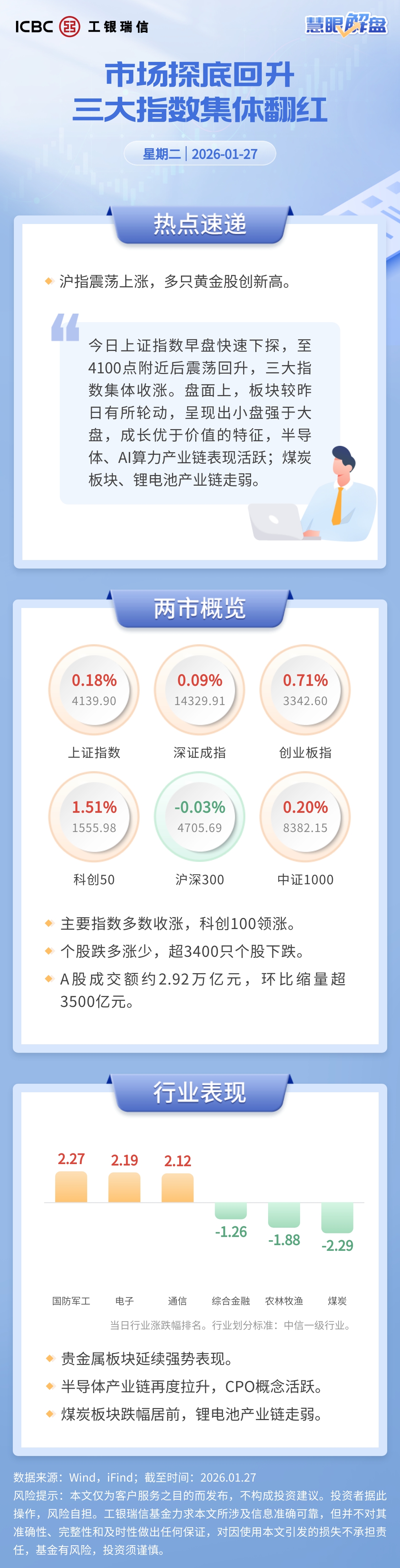 今日上证指数早盘快速下探,至4100点附近后震荡回升,三大指数集体收涨。