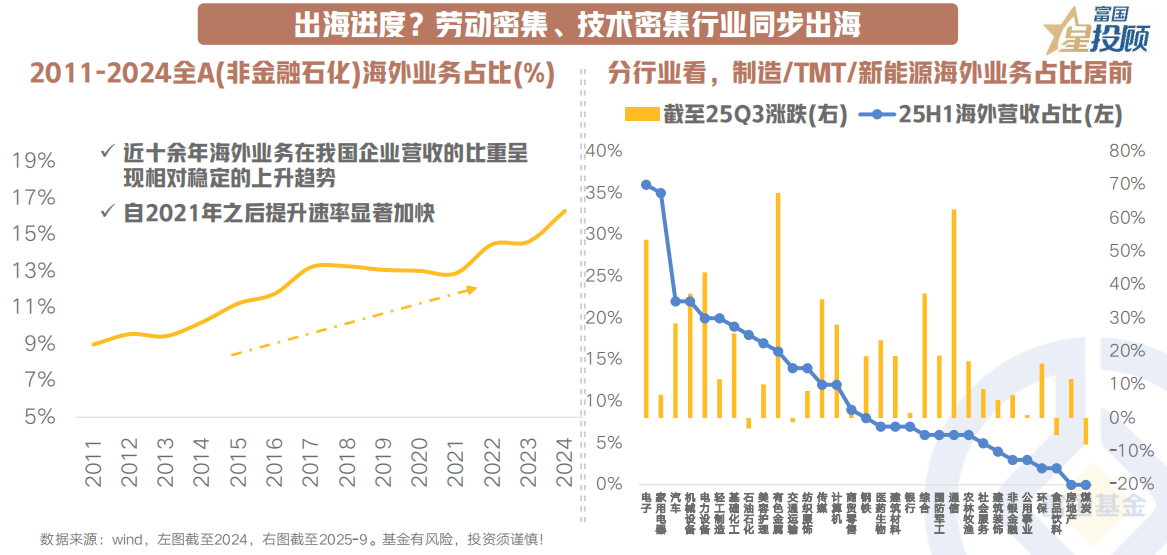 2)超一半的海外收入占比较高的行业在2025Q3仍实现基本面边际上行,主要集中在科技TMT板块和部分新能源,如游戏、元件、消费电子、光伏设备、电池以及农化制品等。