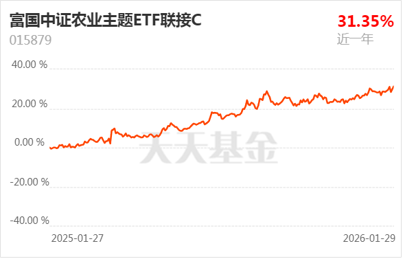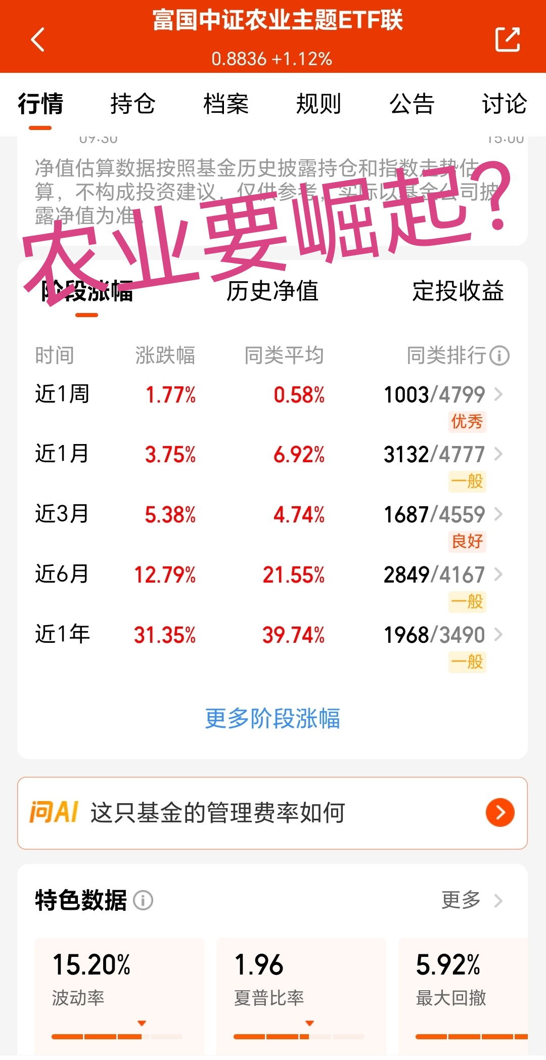 我近期加入自选观察的$富国中证农业主题ETF联接C(OTCFUND|015879)$也是逐渐回暖,昨日上涨1.12%,近一个月上涨3.75%,近三个月涨5.38%,近六个月涨12.79%,近一年涨31.35%,覆盖农产品,农用机械,化肥农药等农业全产业链,估值也处于中长期偏低水平。当下市场震荡加剧,农业防御属性不错,埋伏等风来。