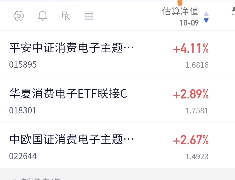 10月9日消费电子板块基金估值来了啦。$平安中证消费电子主题ETF发起式联接C$ 目前估值上涨4.11%,近3个月涨了54.33%,业绩十分出色啊。