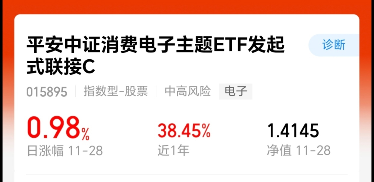$平安中证消费电子主题ETF联接C$今天收涨0.98%,近一年收益率高达38.45%,紧密跟踪中证消费电子主题指数,覆盖元器件生产、 整机品牌设计等产业链核心环节,继续看好