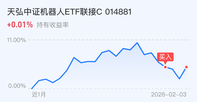 我加仓$天弘中证机器人ETF发起联接C(OTCFUND|014881)$10000元!跟踪的机器人指数前面连续调整了5、6个交易日,昨天刚涨一天,今天又开始调整了,趁这会看跌0.8%左右,我继续大额上车一笔。
