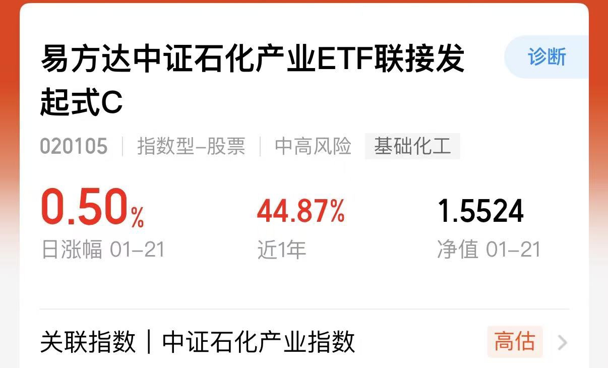 最近市场板块轮动的还是比较快的。前段时间科技是比较火的,但是现在商业航天又开始了,相对这些高标地的板块,我更看好石化的方向。目前他的这个估值相对来说也在低位。$易方达中证石化产业ETF联接发起式C$ 这两天表现还是不错的。他的持仓也全都是龙头股,比较集中,后面的行情更好把握。