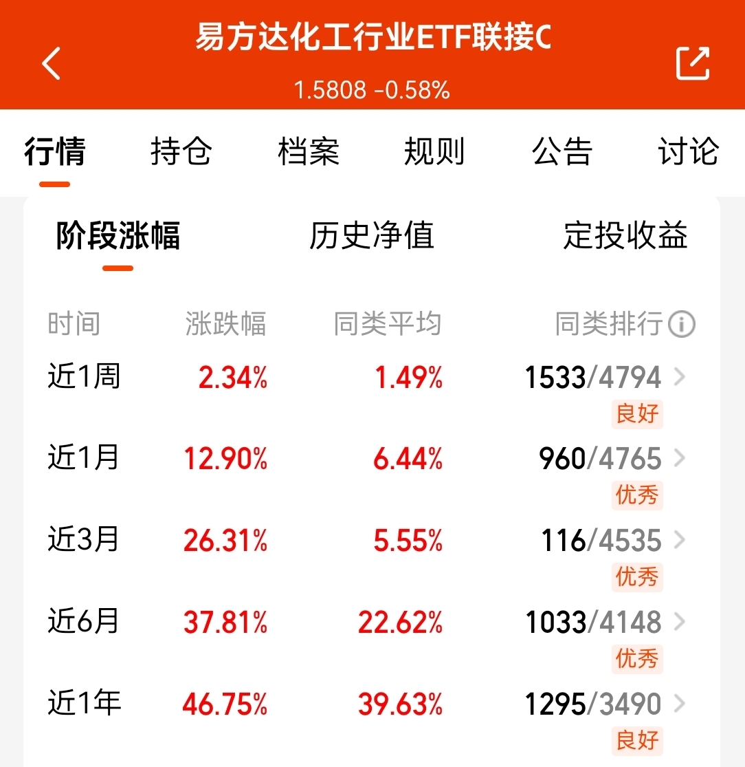 目前行情就是板块轮动,业绩线开始补涨,化工板块今天也开始继续补涨;这支$易方达化