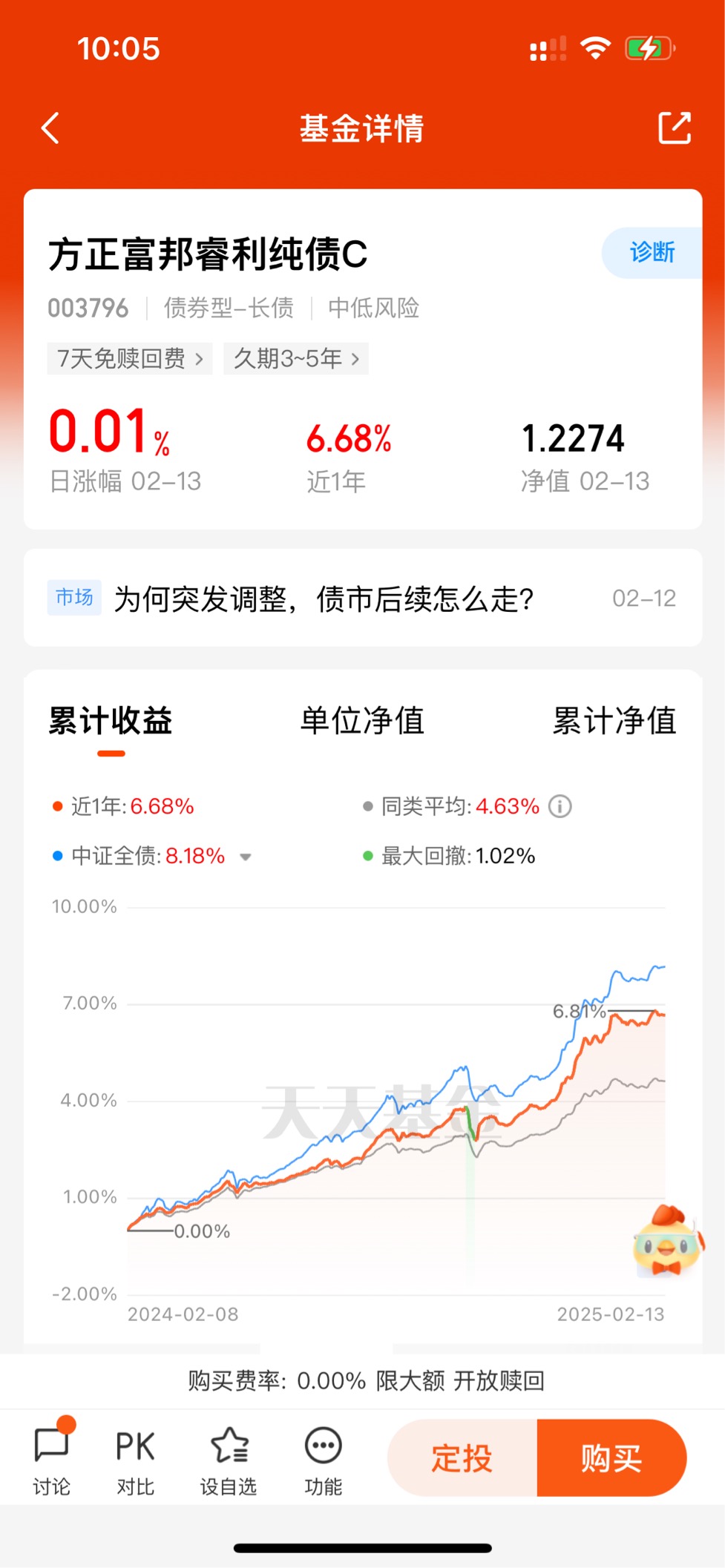 债券基金的稳健性不仅体现在其资产特性上,还体现在其收益的稳定性上。从历史数据来看,债券基金的年化收益率虽然不如股票基金那么高,但胜在波动小、回撤低。在市场不稳定的时候,债券基金能够有效对冲风险,保护资产不受大幅侵蚀。例如,在2025年年初,股市出现了一波调整,许多股票基金净值大幅下跌。而我的债券基金净值却几乎没有受到影响,依然保持着平稳的走势。这种稳健性让我在投资中感受到了一份踏实。