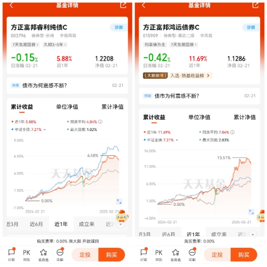 #方正富邦债基姐妹花# 打卡第12天,木瓜认为方正富邦债基具备投资潜力,值得关注。从业绩表现来看,基金收益突出,如方正富邦鸿远债券C近一年收益率达13.31%,远超同类平均;方正富邦睿利纯债C自基金合同生效起净值增长率为22.08%,年化回报达3.04% ,过往四个年份年度收益均为正,整体业绩居前。在投资策略上,它十分灵活,以方正富邦鸿远债券C为例,采用 “纯债+可转债” 策略,以利率债为主,还配置少量信用债和可转债,能在不同市场环境下灵活调整,同时在久期管理上也较为合理,可避免长久期债券的较大波动。投研团队经验丰富,核心固收投资成员从业年限均超过10年,还总结出独特投资方法论,能较好地判定宏观经济趋势和债市走势。当前市场环境也较为有利,2025年货币政策维持稳健充裕,财政政策托底力量加大,全球经济复苏存在不确定性,国内经济增长动力尚未完全恢复,在股市波动加剧或经济增速放缓时,债券的避险属性凸显。不过,债券市场也面临经济超预期复苏导致货币政策转向、利率上升进而引起债券价格下跌,以及信用风险事件导致信用债价值受损等风险,可能会影响方正富邦债基的表现 。@方正富邦基金