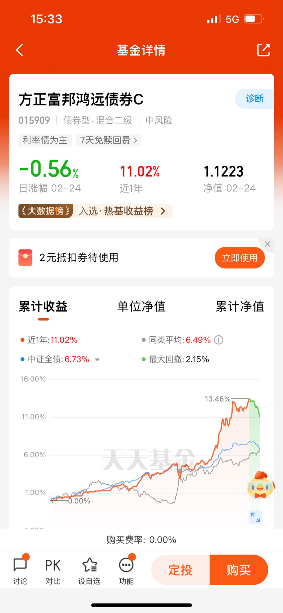 最大回撤才2.15%,这一数据充分体现了基金在风险控制方面的卓越能力。回撤是衡量基金风险的重要指标之一,较小的回撤意味着投资者在投资过程中面临的损失风险较小。在市场行情不好的时候,很多基金的净值会大幅下跌,让投资者遭受巨大的损失。而方正富邦鸿远债券基金能够将最大回撤控制在如此低的水平,说明它在投资过程中注重风险防范,通过合理的资产配置和投资策略,有效地降低了市场波动对基金净值的影响。