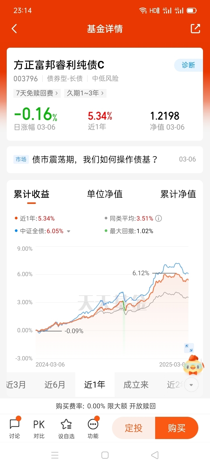 打卡第11天,今日,A股市场及港股市场均呈现出蓬勃的发展态势,上证指数稳健上涨1.17%,恒生指数更是大幅跃升3.29%,创业板指数也紧随其后,涨幅达到2.02%,我关注的方正富邦鸿远债券c却出现了0.59%的小幅下跌,与整体市场的热烈气氛形成了一定对比。