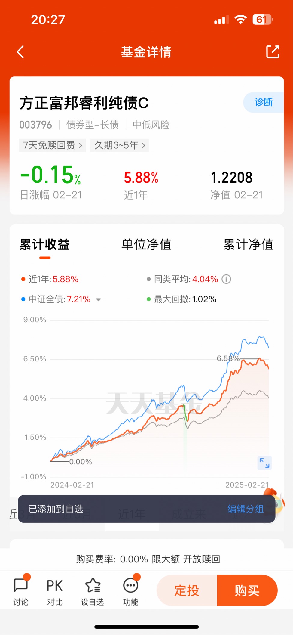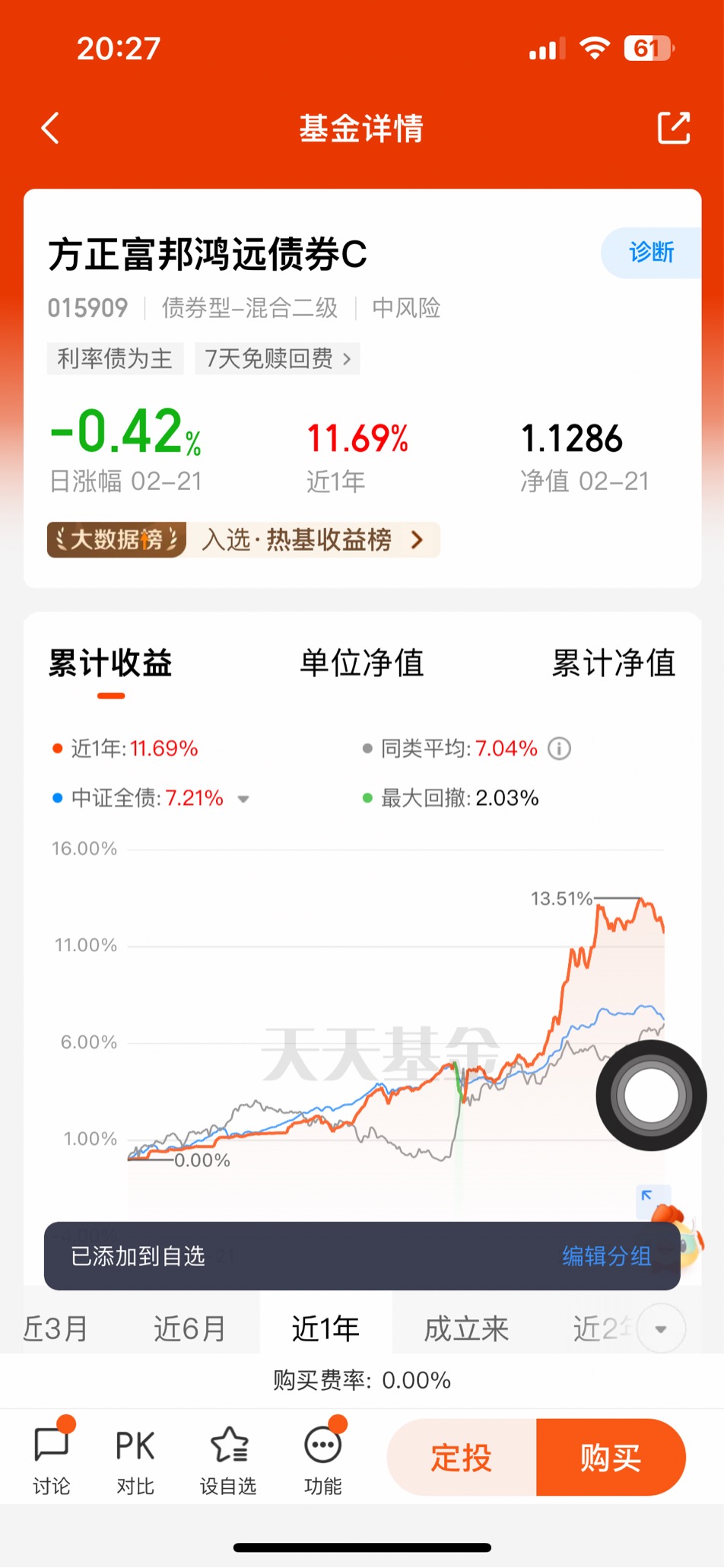 打卡第13天,方正富邦债基投资收益率相对比较稳定,非常适合闲钱理财的小伙伴们进行