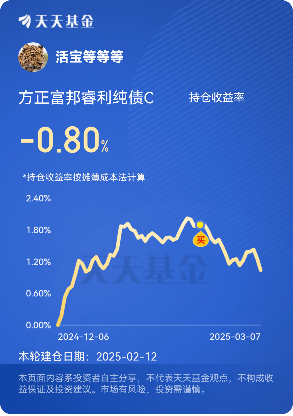 #方正富邦债基姐妹花# 打卡第25天,昨日(2025年3月7日),$方正富邦鸿远债券C$(代码015909)单位净值下跌0.83%,收于1.1165元,近1月跌幅为2.57%,但近1年涨幅仍达9.99%,成立以来累计收益率为11.65%。该基金主要投资于国债和企业债,基金经理牛伟松通过灵活调整资产配置,力求在利率波动中保持收益稳定。相比之下,$方正富邦睿利纯债C$(代码003796)昨日单位净值下跌0.22%,收于1.2171元,近1月跌幅为0.94%,近1年涨幅为5.05%,表现相对平稳。该基金以纯债投资为主,风险较低,适合追求稳健收益的投资者。总体来看,两只基金均表现出较强的抗风险能力,但$方正富邦鸿远债券C$的收益弹性更大,适合风险承受能力稍高的投资者,而$方正富邦睿利纯债C$则更适合保守型投资者。@方正富邦基金 #晒收益#