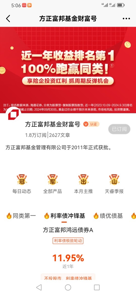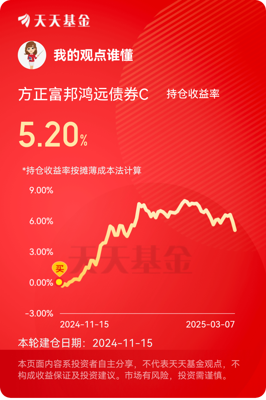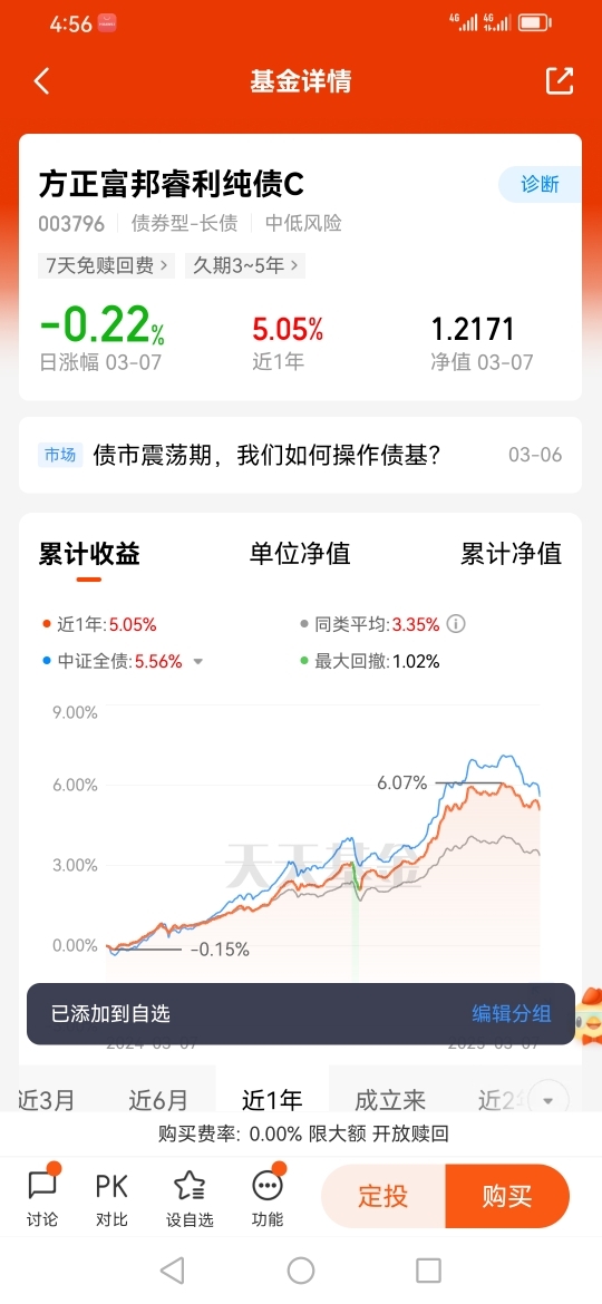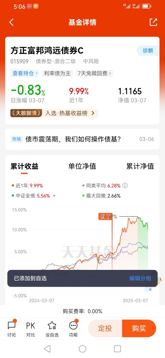 #方正富邦债基姐妹花# 打卡第9天,投资债券其实并不要过于纠结“择时这个问题”,择时对于类似债基这种波动小的资产,其实意义不大,因为即时遇到买在低点而卖在高点的这种可遇而不可求的事情,其超额收益大部分的情况下是不会超过2.5%的,而且如果在债基这类资产上做择时的话,往往还要面临另一个“风险”,那就是净值修复的时间风险,因为我做过认真的统计,从2014年到2024年这整整十年里面,对于短债基有8年的年内最大回撤在0.77%以内,而且其修复最大回撤所用的时间的中位数为14天,而对于长债基金,这十年里面的平均最大回撤率为1.10%,而其修复最大回撤所用时间的中位数是33天,而就最近十年短债基金与长债基金的年化收益率来看,前者的平均年化收益率为2.71 %,后者更是达到了3.97%,所以从年内最大回撤率与收益率这个角度来比较的话,对于大部分投资者而言,采用择时的方式是否多少有点“捡了芝麻丢了西瓜”的感觉。所以我会继续陪伴方正富邦鸿远债券C(015909),它是我的理财好帮手。@方正富邦基金
